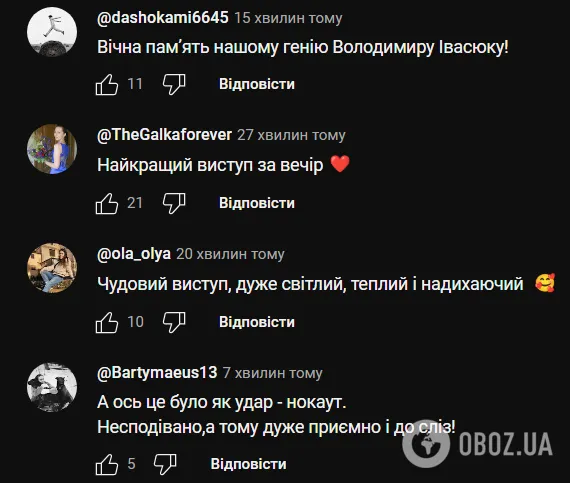 Виступ став завершальним та знаменував початок голосування. Емоційне виконання відомих пісень Івасюка розчулило україців.