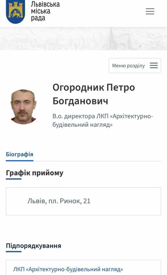 Правоохоронці не розголошують прізвище затриманого керівника. Однак, на сайті ЛМР вказано, що підприємство очолює Петро Огородник. Він вказаний виконувачим обов’язків керівника львівського комунального підприємства «Архітектурно-будівельний нагляд»