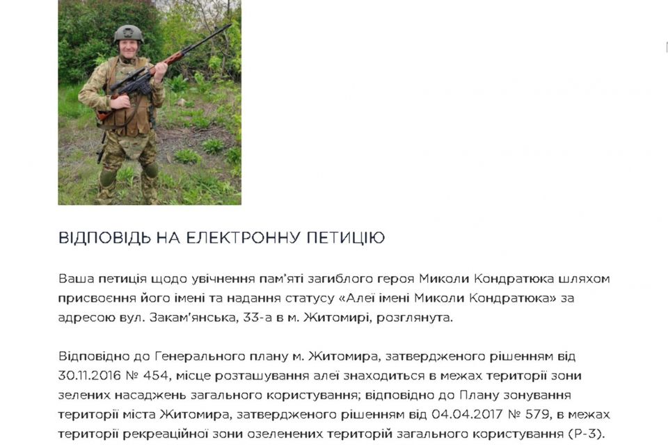 Ваша петиція щодо увічнення пам’яті загиблого героя Миколи Кондратюка шляхом присвоєння його імені та надання статусу «Алеї імені Миколи Кондратюка» за адресою вул. Закам’янська, 33-а в м. Житомирі, розглянута.