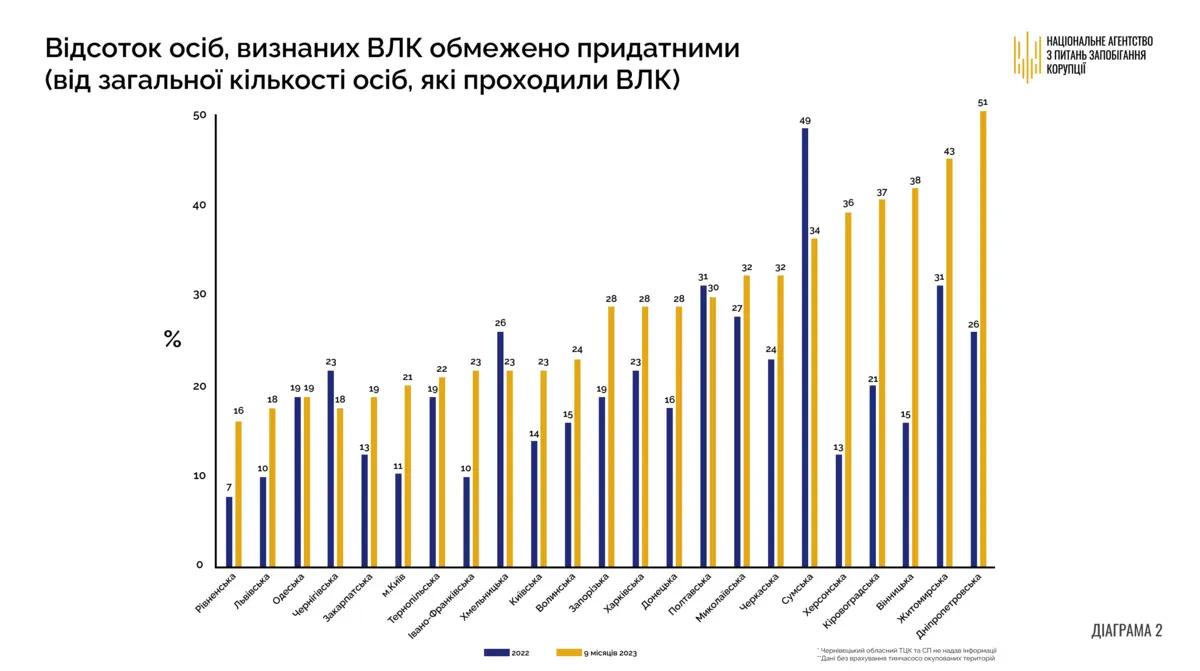 – відсоток осіб, визнаних ВЛК непридатними до військової служби, від загальної кількості тих, хто проходили ВЛК: 6% у 2022 році та 2% у 2023 році, тобто втричі менше. Середній показник по Україні був 8%.