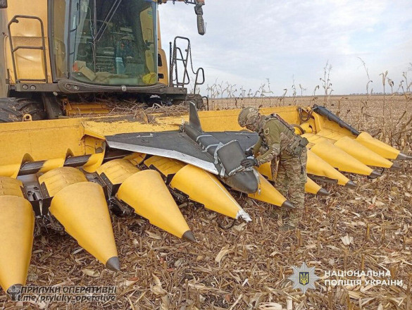 «Вночі під час збору врожаю у жатку комбайна потрапив збитий ворожий безпілотник. На щастя, ніхто не постраждав. Аграрії одразу ж відійшли на безпечну відстань і набрали «102»», – розповідає вибухотехнік поліції Чернігівщини Олександр Жагловський.