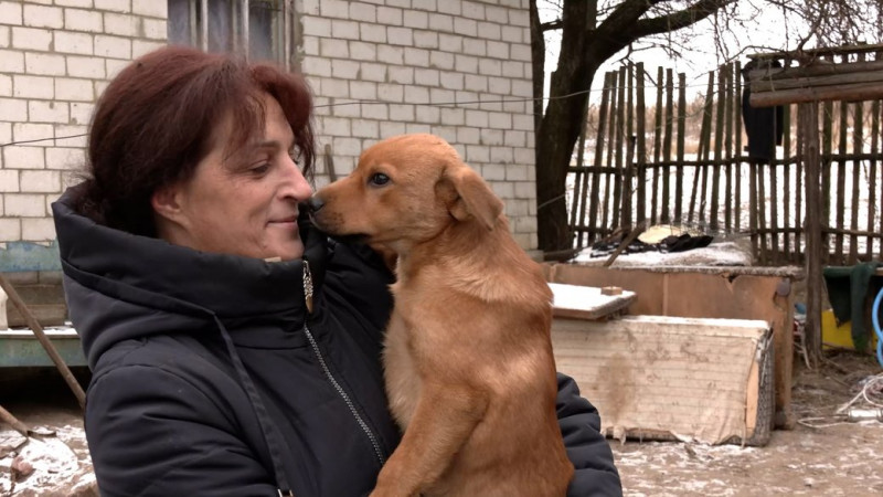 Переселенка Ірина Синєгуб з одним зі своїх собак. ФОТО: Суспільне Чернігів