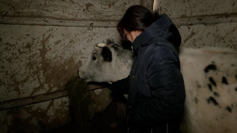 Переселенка Ірина зі своєю коровою Білкою. ФОТО: Суспільне Чернігів"Коли її заводила в машину, у неї сльози текли – вона думала: що її на м'ясо",– каже Ірина Синєгуб.