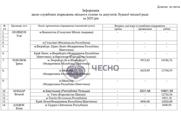 Згідно з додатком до відповіді Луцької міської ради, у списку осіб, на чиї відрядження виділялися кошти, зазначені: