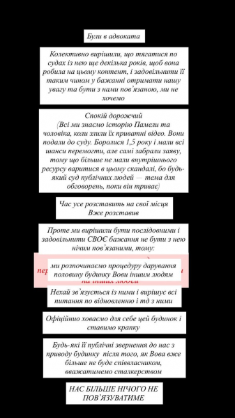 «Ми вирішили бути послідовними у своєму бажанні не мати з нею нічого спільного. Тому ми розпочинаємо процедуру дарування половини будинку Вови іншим людям. Нехай вона зв’язується з ними та вирішує всі питання щодо відновлення тощо вже з новими власниками. Офіційно “ховаємо” для себе цей будинок і ставимо крапку. Будь-які її публічні звернення до нас щодо будинку після того, як Вова перестане бути співвласником, ми вважатимемо сталкерством. Нас більше нічого не пов’язуватиме», — написала Катерина.