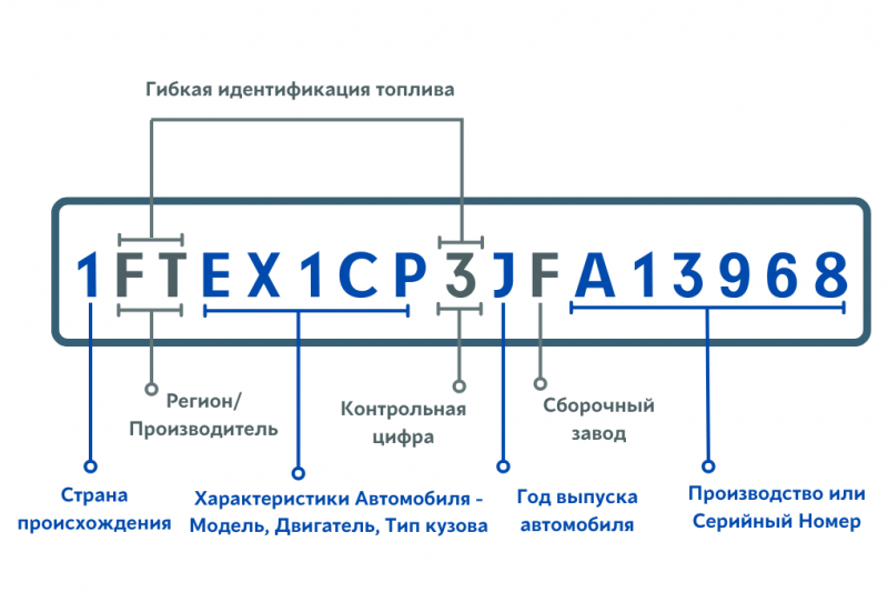 Читают уникальные 17 символов слева направо. Три знака, написанные с самого начала, указывают географию сборки автотранспортного средства и компанию-производителя. Последующие шесть знаков расскажут об установленном силовом агрегате, приводной установке, типе кузова и коробки. А серийный номер, дату выпуска узнают из последних восьми символов VIN.