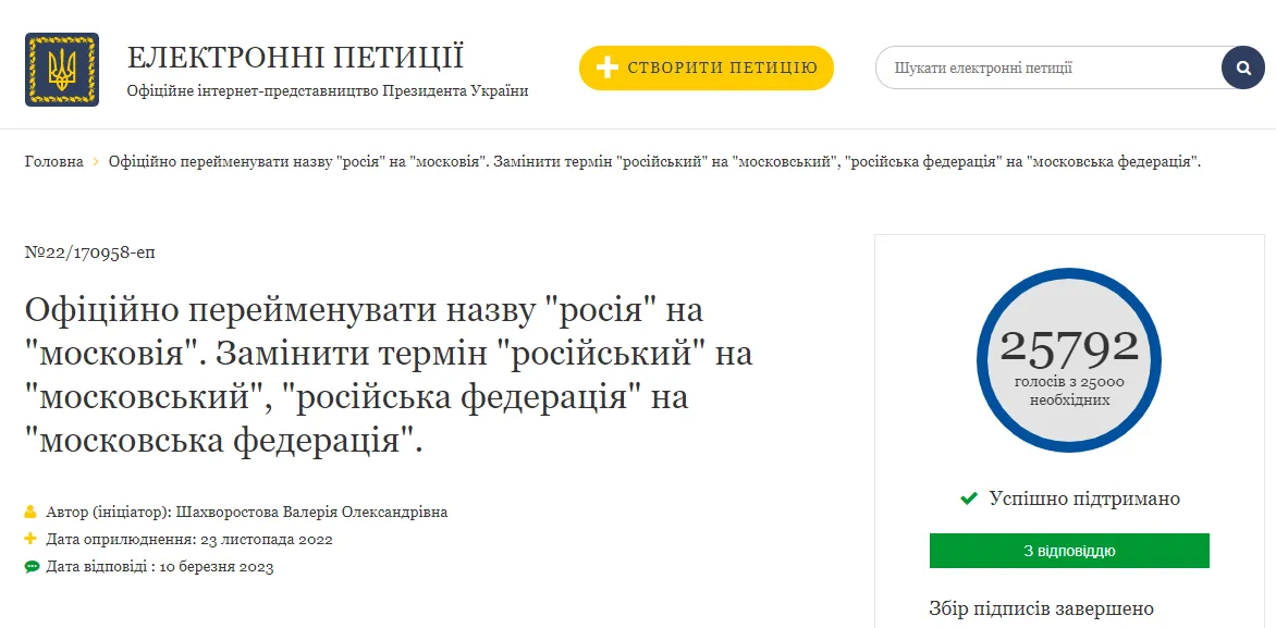Електронна петиція з вимогою офіційно перейменувати назву “Росія” на “Московія”, а також замінити термін “російський” на “московський” і “Російська Федерація” на “Московська Федерація” зібрала необхідних для розгляду 25 000 підписів. Президент України Володимир Зеленський доручив прем’єр-міністру Денису Шмигалю опрацювати це питання та повідомити про результат.