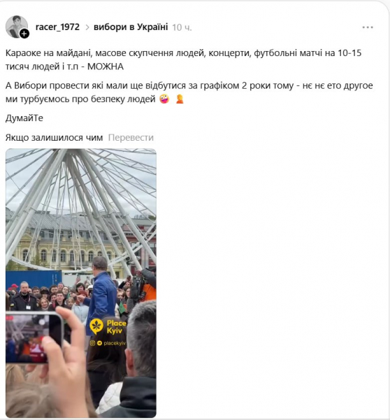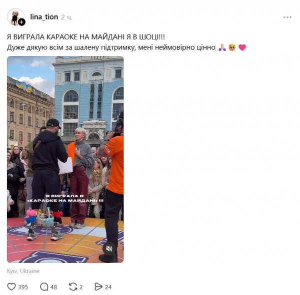 У суботу, 25 квітня, у Києві стартували зйомки легендарного музичного проекту “Караоке на майдані”, який відродили заради благодійної мети – підтримки реабілітаційного центру “Титанові”. Шоу відбулося на Контрактовій площі та послухати виступи зібралися сотні городян. Це викликало невдоволення в соцмережах – багато хто писав про те, що таке скупчення людей небезпечне під час війни. Також користувачі дорікали організаторам за те, що веселі пісні та танці недоречні на тлі трагедії у Дніпрі, де від російських ударів загинуло 8 людей і понад 50 отримали поранення.