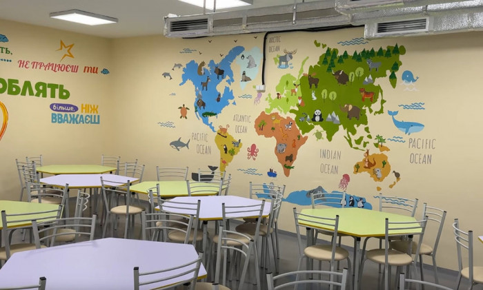 Буфет, кабінет медсестри, роздягальня. В укритті є все, аби діти могли з комфортом перечекати небезпеку та продовжити навчання. Облаштовані і вбиральні, окремо є інклюзивний туалет та душова.
