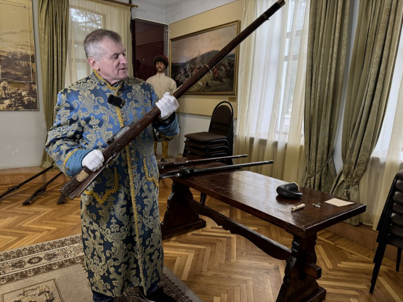 Старший науковий співробітник заповідника «Поле Полтавської битви» Сергій Макаренко показує унікальну козацьку рушницю. Суспільне Полтава