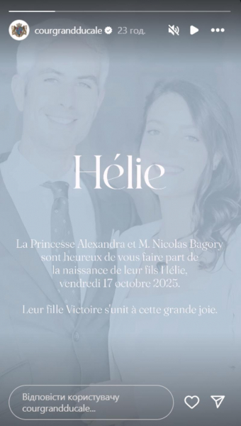 «Принцеса Александра та пан Ніколя Багорі раді повідомити про народження сина Елі у п’ятницю, 17 жовтня 2025 року. Їхня дочка Вікторія поділяє цю величезну радість»,— говориться в повідомленні.