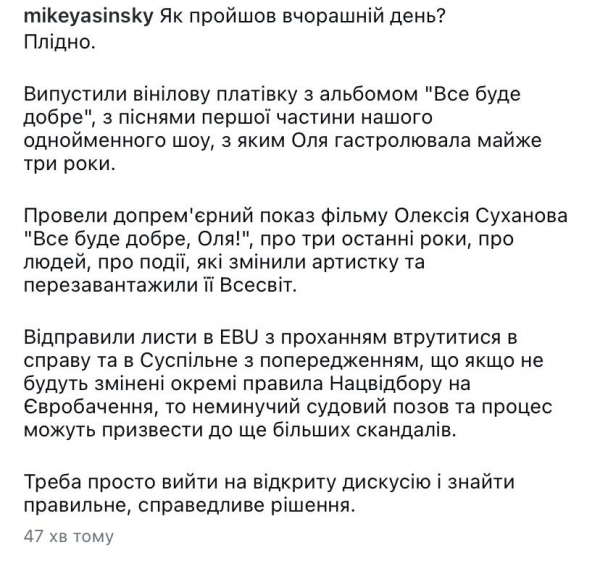 Продюсер Олі Полякової Михайло Ясинський разом із командою співачки звернувся до Європейського мовного союзу (EBU) з проханням закликати “Суспільне” до перегляду правил українського нацвідбору. Про це він повідомив у соцмережах.