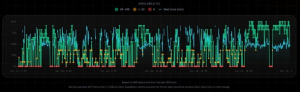 Дані трекера свідчать, що більшість часу сервіс або недоступний, або працює з мінімальною кількістю автомобілів. Протягом останнього тижня Robotaxi був недоступний приблизно 60% часу. Маккенна пояснює, що кожні п’ять хвилин система перевіряє час очікування в 11 різних точках зони обслуговування. Якщо застосунок показує “високий попит” або помилку, сервіс вважається недоступним. При цьому часто Robotaxi не працює ні в одній точці, навіть у межах офіційного робочого часу.