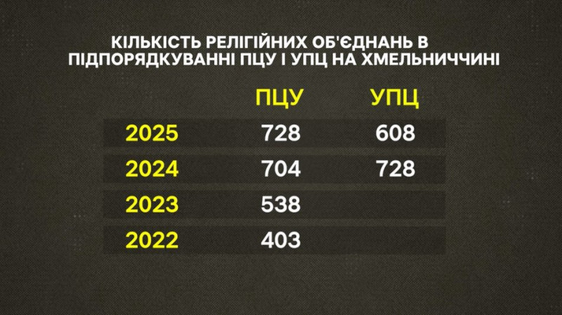 "Було 403 церкви, на сьогоднішній день їх стало 728. Тобто на 325 громад збільшилася громада ПЦУ в Хмельницькій області, які перейшли від УПЦ. Тобто, від УПЦ вийшли теж 325 громад. Але там частина, 32 громади, перейшли в незалежність, тому до ПЦУ також приєдналися церкви Київського патріархату та автокефальні", — зазначила Людмила Черевченко.
