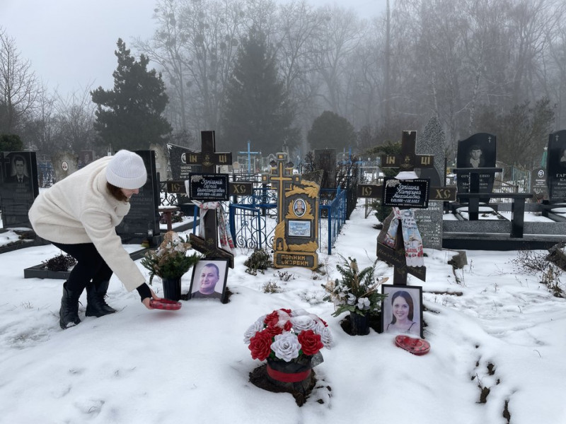 Тетяна Запішня біля могил брата та його сім’ї. Суспільне Полтава"Не хотіли жити в селі. Хотіли в місті, де більше можливостей для дітей, більше розвитку, гуртки. Коли чоловік мені скинув фото прильоту, то я побачила, що дуже схожий будинок на їхній. Я надіялась до останнього, що це просто, там же багато однакових будинків, більш-менш схожі усі. Просто їхала тоді, молилася, щоб це був не їхній будинок".