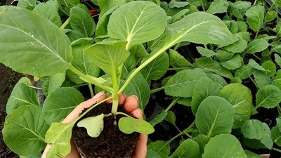 Розсада капусти, яку тримають у руці, на тлі багатьох інших молодих рослин, Хмельниччина. Іванна Білоус