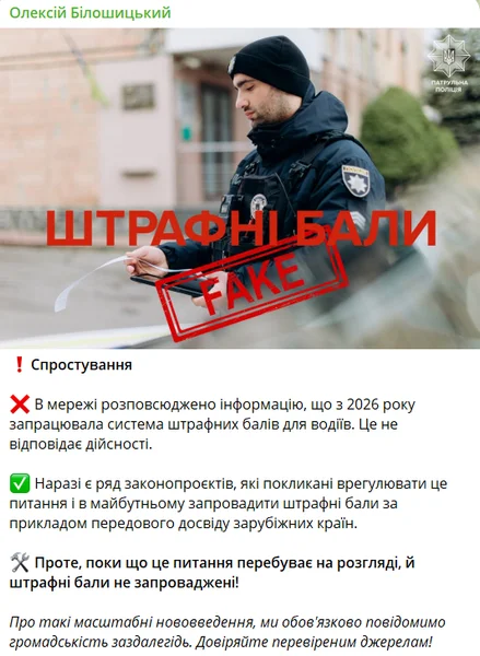 “Наразі існує низка законопроєктів, які покликані врегулювати це питання і в майбутньому запровадити штрафні бали за прикладом передового досвіду зарубіжних країн. Однак наразі це питання перебуває на розгляді, і штрафні бали не запроваджено! Про такі масштабні нововведення, ми обов’язково повідомимо громадськість заздалегідь”, — наголосив він, попросивши довіряти лише перевіреним джерелам інформації.