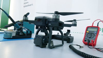 "Це коптер для оприскування полів. Працює на батареї 10 хвилин, зарядка 15 хвилин, енергоефективний. Економить і час, і пальне. 18 гектарів обробляє за годину", – каже Сергій Мельничук.