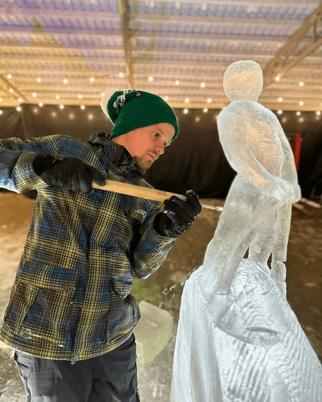 Олексій Пода з Полтави під час створення скульптури з льоду. Фото: Instagram/ Oleksiy Poda