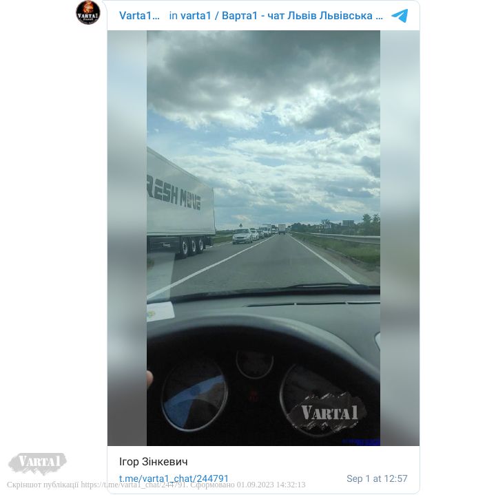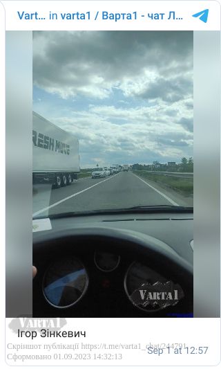 «ДТП за участі двох вантажівок. Ускладнення в русі транспорту», йдеться в повідомленні в оперативному чаті Varta 1 у Telegram.
