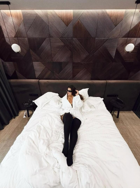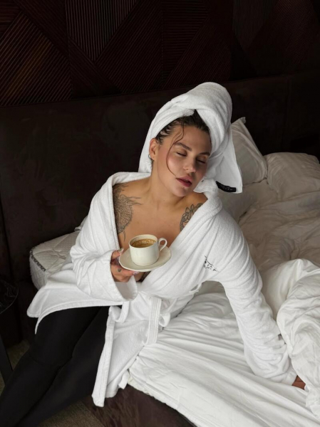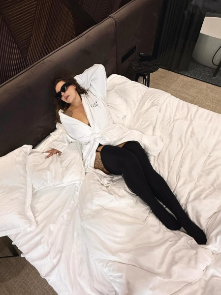 На кількох кадрах Олександра позувала в панчохах, прикриваючи оголені груди глянцевим журналом. На інших фотографіях зірка зафіксована у білому халаті на великому ліжку в готельному номері.