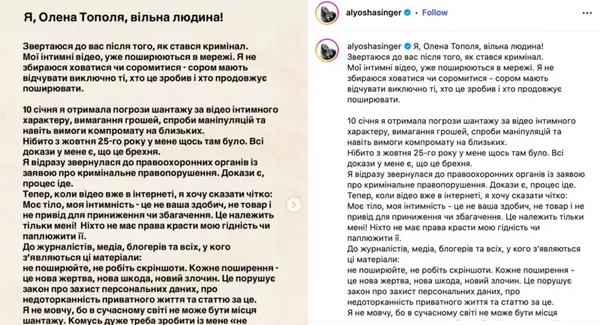 «Я отримала погрози шантажу за відео інтимного характеру, вимагання грошей, спроби маніпуляцій», – написала Тополя.