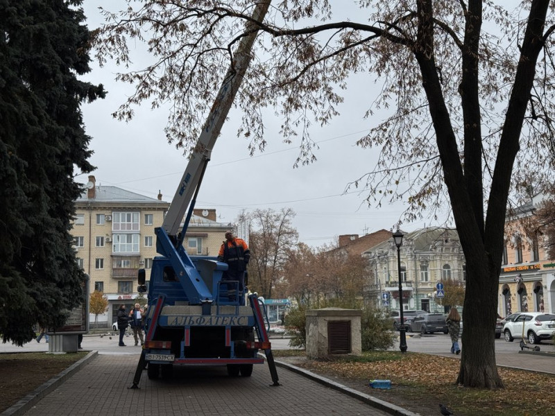Працівники підприємства «Міськсвітло» за допомогою спецтехніки встановлюють новорічну ілюмінацію на деревах у Полтаві. Суспільне Полтава