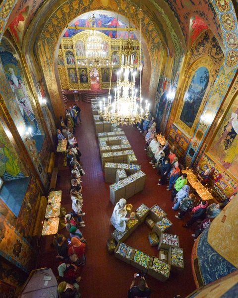 Сьогодні у Свято-Михайлівському соборі Православної церкви України освятили тисячі пасочок та дитячі обереги, які відправляться на передову.