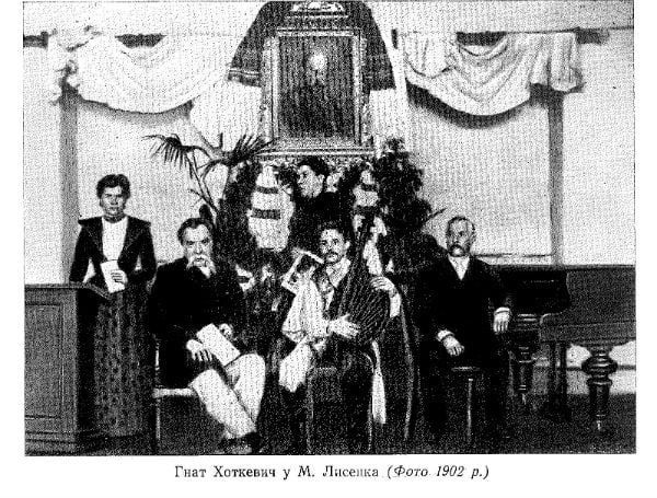 Гнат Хоткевич серед кобзарів на Археологічному зʼїзді в 1902 році (фото з Вікіпедії)
