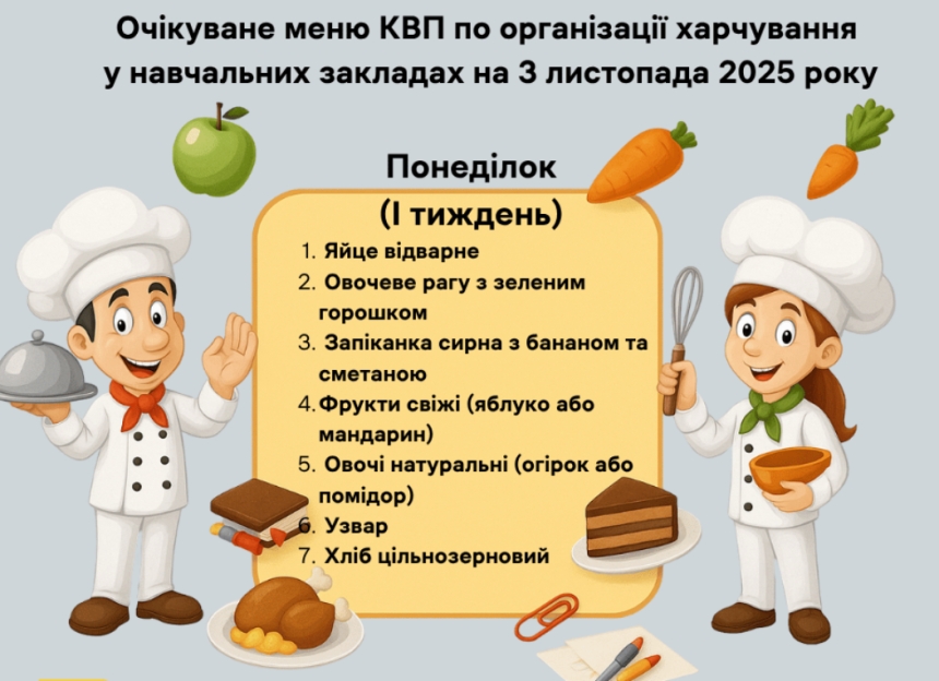 Згідно з новим меню, у понеділок, 3 листопада, дітям пропонували: відварене яйце, овочеве рагу, запіканку, фрукти, овочі, цільнозерновий хліб та узвар.