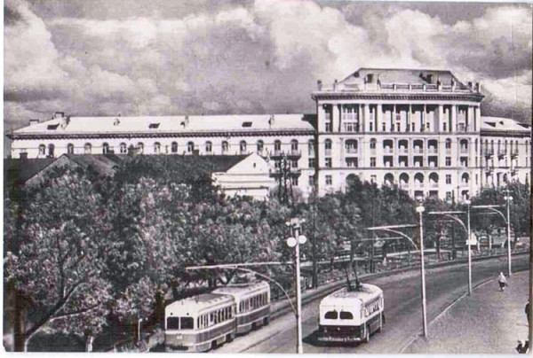 Центральне місце в ньому займає будинок №82 по Проспекту. Він насправді монументальний та вражаючий. Був збудований у 1953 році по проекту архитектора Яковлева. Судячи з дому та транспорту (трамваю та тролейбусу) світлина була зроблена десь у наприкінці 1950-х, або на початку 1960-х..
