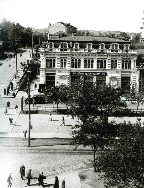 “1933 рік. Вид на кут проспекту К.Маркса (Яворницького) та вулиці К.Лібкнехта (Грушевського). Двоповерхова з мансардним поверхом ажурна будівля на розі, до революції належала купцю Зільберману і входила до торгового ряду Нижньо-Троїцького базару.