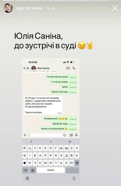 Саніна додала, що надалі спілкування відбуватиметься виключно через юридичних представників. Кір’янов опублікував особисту переписку із Саніною, де на згадку про невиплачені кошти вона написала “в суді розберемося”.