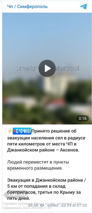 «Прийнято рішення про евакуацію населення довколишніх сіл в радіусі 5 кілометрів від місця НП в Джанкойському районі в пункти тимчасового розміщення. За попередньою інформацією, обійшлося без жертв.
