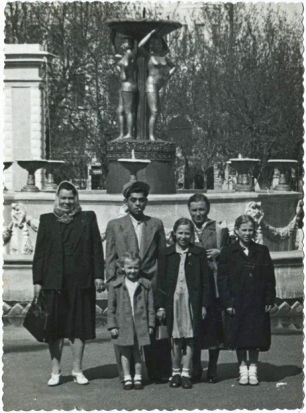 На початку 1950-х у сквері напроти дому по проспекту Яворницького (тоді Карла Маркса) з’явився фонтан у стилі «сталинського ампіру» «Три грації». Він став центральним елементом скверу, який від Проспекту відділяла невеличка загорожа.