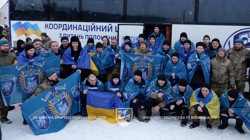 Військові 36 окремої бригади морської піхоти ім. М. Білинського, яких звільнили з полону РФ 5 лютого 2026 року. 36 ОБрМП/Facebook