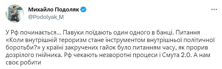 По словам Подоляка, в России, в которой продолжается “закручивание гаек”, было лишь вопросом времени, когда “внутренний терроризм станет инструментом внутренней политической борьбы”.