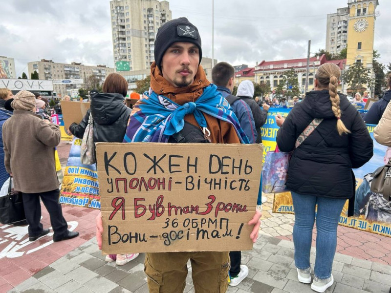 Підтримати своїх побратимів приходить на акції військовослужбовець Валентин Полянський. Він у 2022 році з заводу ім. Ілліча, що у Маріуполі, потрапив в російській полон і пробув там 3 роки. Півроку тому був звільнений.