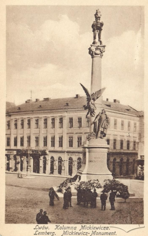 Пам’ятник Адаму Міцкевичу відкрили понад 100 років тому, у 1904 році. Питання вигляду споруди викликало чимало дискусій серед львівських художників, скульпторів та архітекторів. У результаті, ухвалили рішення, що основою монумента буде колона, адже завдяки цьому пам’ятник вирізнятиметься від інших у місті. Проте далеко не всі львів’яни його прийняли, у народі його називали «олівець».