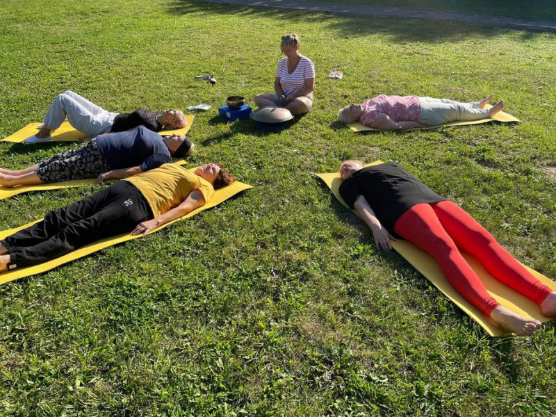 Заняття із розслаблення тіла, яке проводить фахівчиня, Хмельниччина. Facebook/ ГО “Тепло рідних сердець”