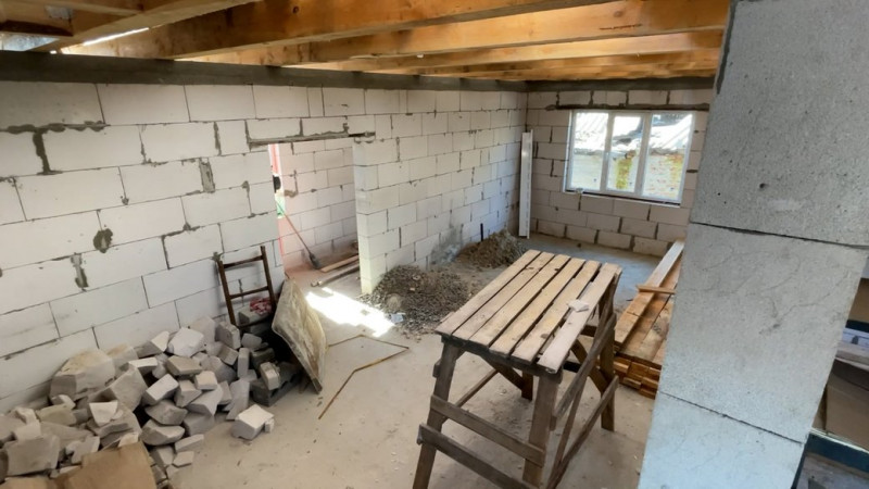 Наразі будинок готовий на третину. Є стіни, дах, закладені підземні мережі, на другий поверх ведуть сходи. Там будуть три спальні для двох доньок і сина. На черзі – утеплення, внутрішні роботи. Для цього родина вже придбала більшість будівельних матеріалів.