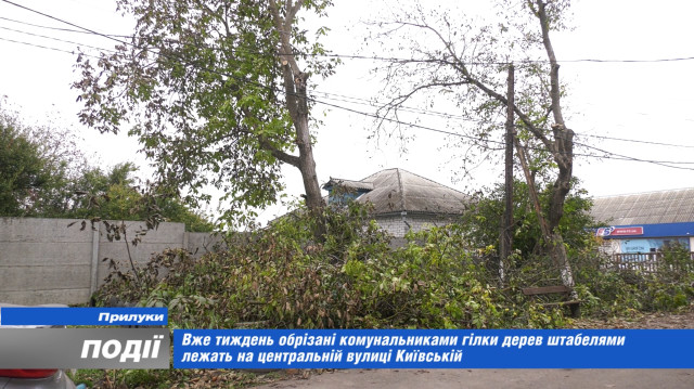 Вже тиждень обрізані комунальниками гілки дерев штабелями лежать на центральній вулиці Київській. Планову обрізку тих дерев, крони яких сягають ліній електромереж, працівники прилуцького РЕМ проводять періодично, таким чином намагаючись уберегти лінії від поривів в часи негоди і убезпечити мешканців від нещасних випадків.