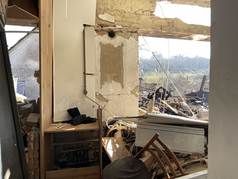 "На кухні найбільше часу ми проводили. Я записував рецепти. Дружина записувала рецепти, приїжджали до нас гості. Теж нещодавно ми тільки зробили ремонт. І найбільше постраждала вхідна зона. Це коридор і ванна кімната, вирвало стіну і все обвалилося. Туди ми доступу не маємо і вхід у будинок – його немає", — розповів Олександр Глазов.