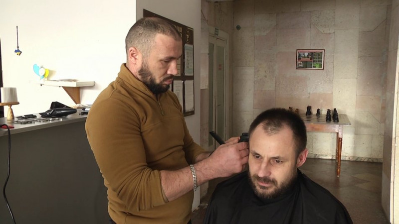 Віталій і ветеран під час стрижки волосся, лютий 2026 року, Хмельниччина. Суспільне Хмельницький