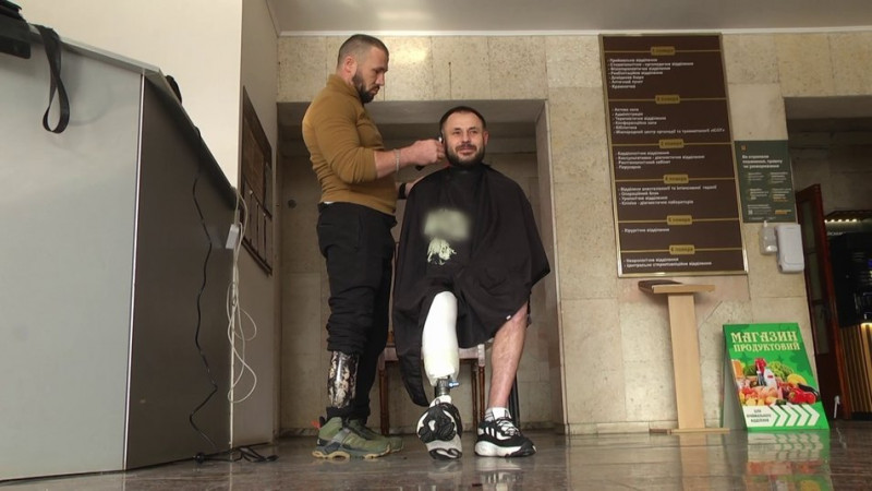 Віталій Онищук стриже ветерана, який також втратив кінцівку, у одному із медичних закладів, лютий 2026 року, Хмельниччина. Суспільне Хмельницький