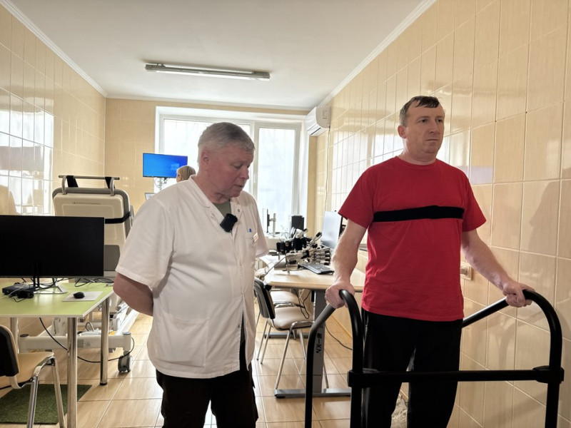 Фахівець із супроводу ветеранів проводить заняття із пацієнтом на спеціальному тренажері. Суспільне Полтава