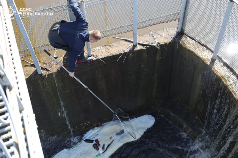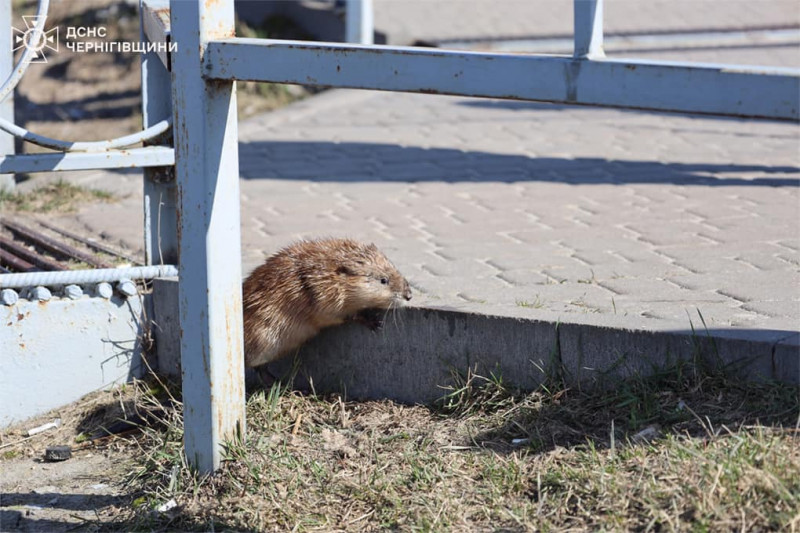 По обіді 27 березня до чернігівських надзвичайників надійшло повідомлення від місцевих жителів обласного центру про те, що до споруди дамби на річці Стрижень потрапила ондатра, яка не в змозі самостійно вибратися.