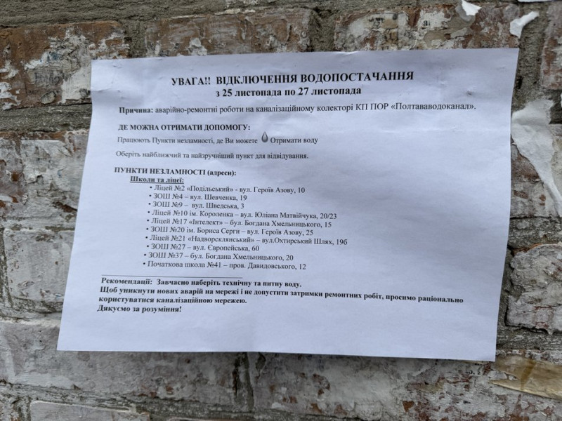 Як повідомили у пресслужбі Полтавської міської ради, у районах відключення впродовж двох днів працюватимуть 10 пунктів незламності, де можна буде отримати технічну та питну воду. Задля цього залучили резервні автоцистерни комунальних служб та рятувальників.