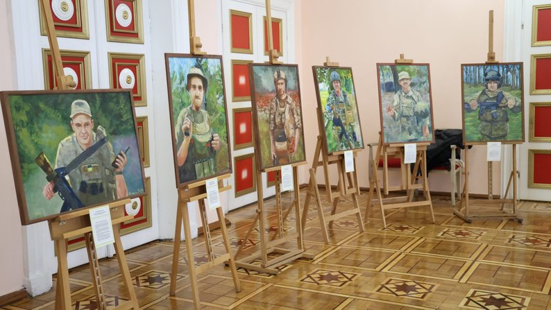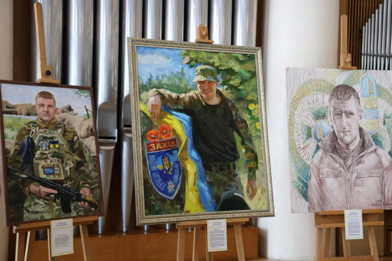 На виставці представлені 34 портрети українських захисників, жовтень-2025 року. Хмельницька ОВА