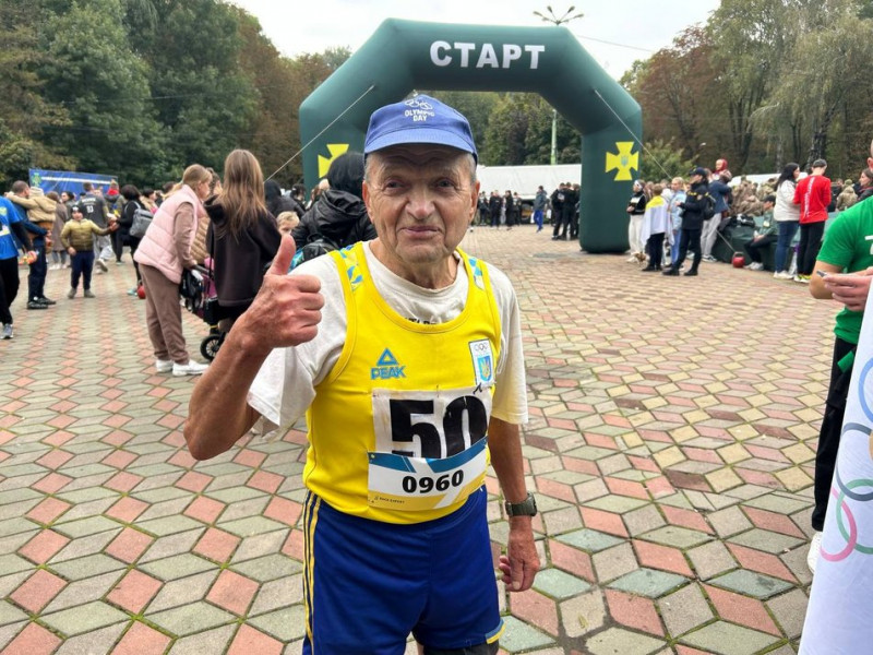 87-річний Володимир Федорович з Ярмолинців брав участь у благодійному забігу на дистанції 3 км, 4 жовтня 2025 року. Суспільне Хмельницький